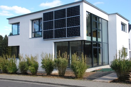 Realisiert werden diese Ansprüche durch die Kombination einer hochwertigen luftdichten Gebäudehülle, einer nach Süden ausgerichteten, großflächigen Glasfassade, zukunftsweisender Haustechnik mit Einsatz erneuerbarer Energie sowie intelligenter Speichersysteme.